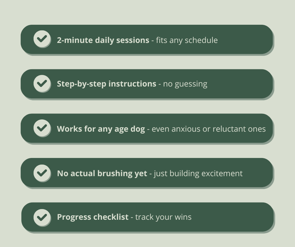 This approach is different. We build positive associations before any brushing happens. Your dog learns that dental time means good things are coming.